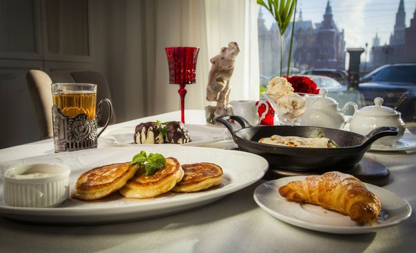Приходите с утра — завтраки практически всегда наиболее доступные даже в самых дорогих местах. Итак, здесь можно отведать различные блюда из яиц: яичницу с жареными хлебцами (285 рублей), с помидорами (380 рублей) или яичницу с грибами (370 рублей). Так же есть блины со сметаной (160 рублей) и блины с топленым творогом (345 рублей), каша с клубникой (270 рублей) и йогурт с черникой или малиной (215 рублей).