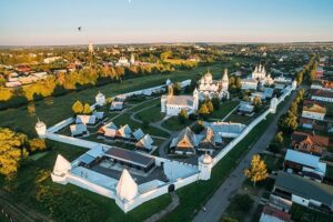 Суздаль похож на сказочный городок. Он входит в состав Золотого кольца России. Это настоящий музейный город: тут кругом старинные постройки и невероятные пейзажи. Характерная панорама Суздаля — белокаменные кремлевские стены по берегам реки и сверкающие на солнце купола церквей в обрамлении заповедных лугов. В городе 32 действующих храма и более 150 памятников архитектуры. Здесь только малоэтажная постройка — чудесно!