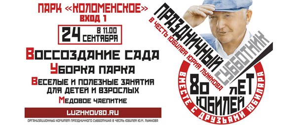 В парке Коломенское пройдет открытый праздничный субботник в честь 80-летия Юрия Лужкова. Целью субботника станет воссоздание фруктового сада. Все участники получат подарочные фартуки, дождевики и, конечно же, кепки юбиляра! Для маленьких гостей будет построен шатер, где будут работать опытные аниматоры.