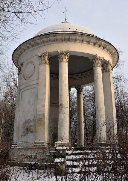 Когда то в спокойных водах одного из прудов усадьбы мерцало грациозное отражение павильона «Эрмитаж» с лестницей возле самой кромки воды. Но время внесло свои коррективы, и павильон не сохранился, как и другие затейливые малые архитектурные формы. Единственным мелким строением, что сохранило безжалостное время, стала беседка-ротонда на маленьком острове. Она имеет совершенные пропорциональные формы и, проглядывая сквозь листву, притягивает взоры путников.